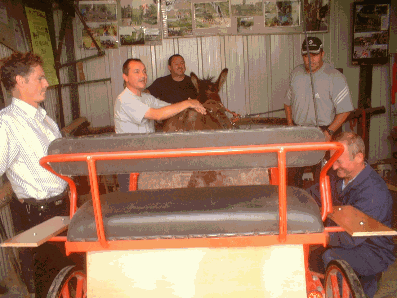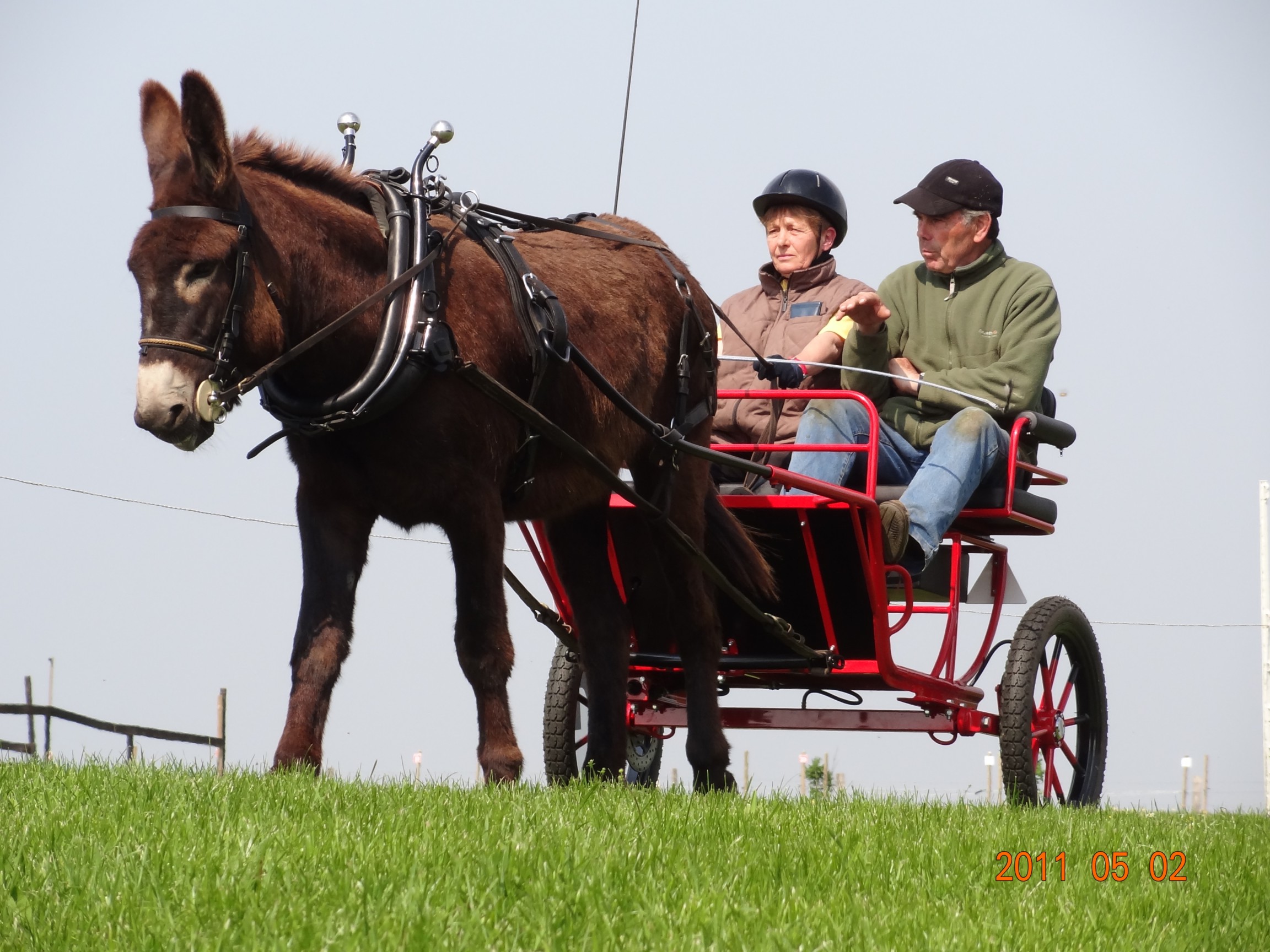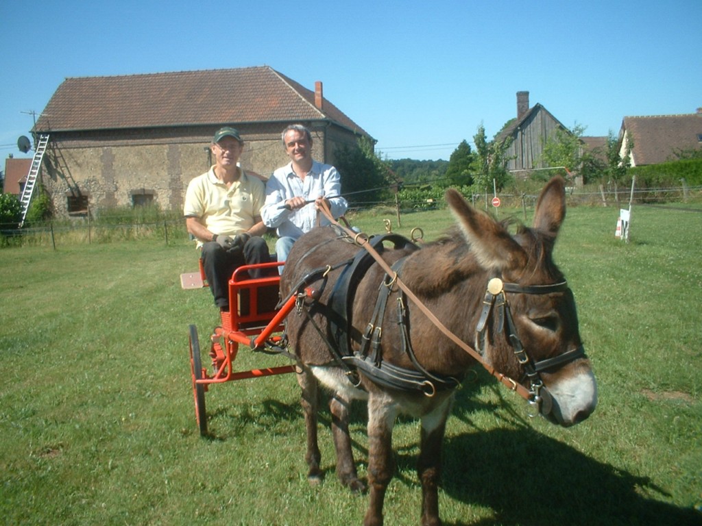 Le samedi qui suivit le stage, j’ai garni et attelé mes compagnons et nous sommes allé faire notre petit tour hebdomadaire, accompagné d’un ami, et oui nous ne rêvions pas, nos ânes étaient attelés en paire, mon pote n’en croyait pas ses yeux. Au début un peu nerveux et surtout content de sortir, puis ensuite docile et obéissant, au pas, au trot, au pas, au galop, droite, gauche, ho, hue etc…….Magique !!! MERCI Gérard, MERCI.