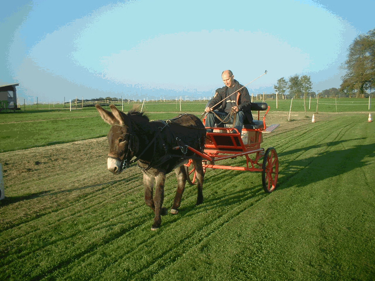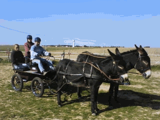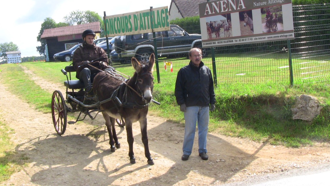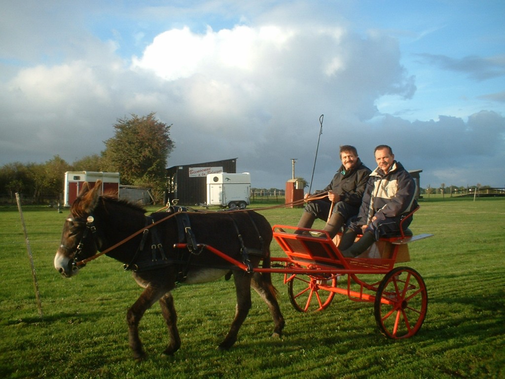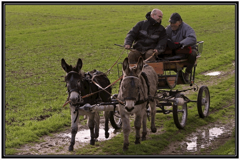 Le samedi qui suivit le stage, j’ai garni et attelé mes compagnons et nous sommes allé faire notre petit tour hebdomadaire, accompagné d’un ami, et oui nous ne rêvions pas, nos ânes étaient attelés en paire, mon pote n’en croyait pas ses yeux. Au début un peu nerveux et surtout content de sortir, puis ensuite docile et obéissant, au pas, au trot, au pas, au galop, droite, gauche, ho, hue etc…….Magique !!! MERCI Gérard, MERCI.