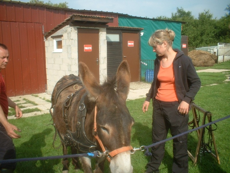 Je suis d’abord allé en stage 2 jours chez « ANENA » à Villotran et accompagné de 9 autres stagiaires nous avons appris à panser, garnir, atteler et mener l’attelage avec « Teddy » et « Balthazar », les ânes de Gérard.