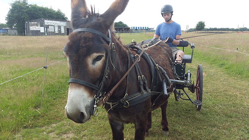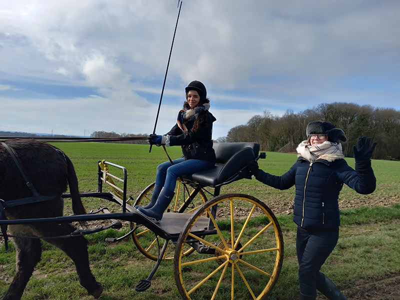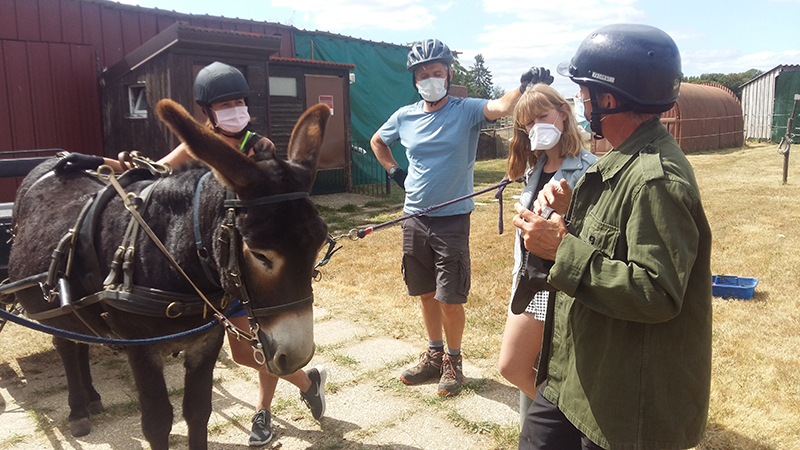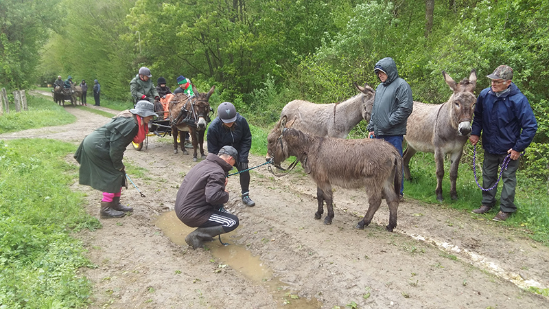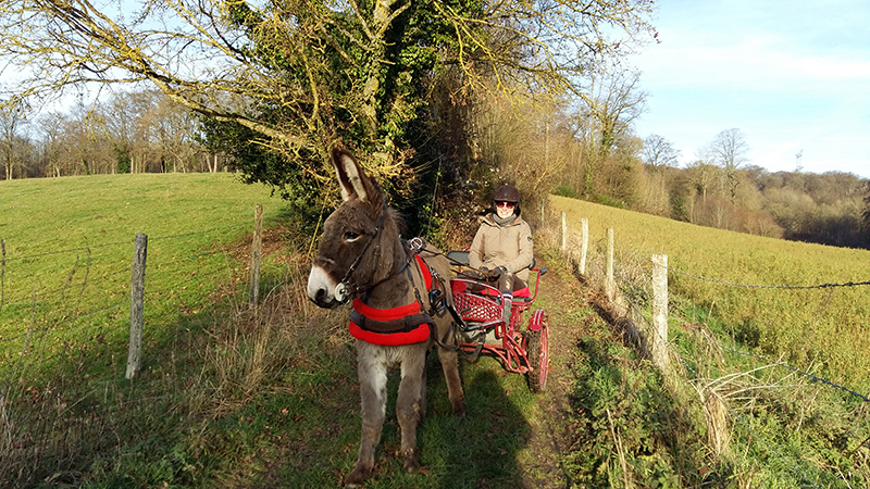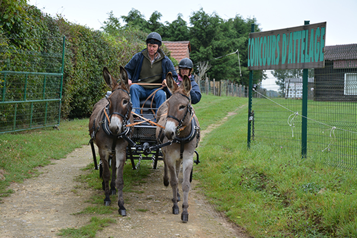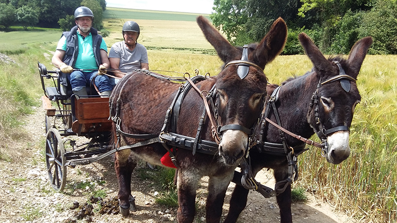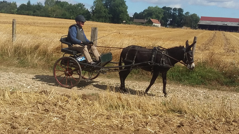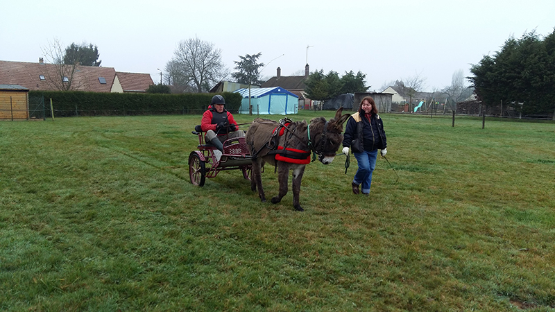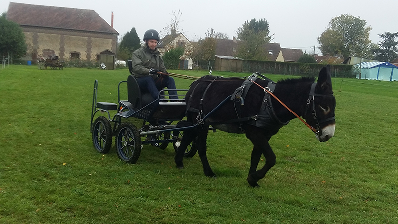 Je suis d’abord allé en stage 2 jours chez « ANENA » à Villotran et accompagné de 9 autres stagiaires nous avons appris à panser, garnir, atteler et mener l’attelage avec « Teddy » et « Balthazar », les ânes de Gérard.