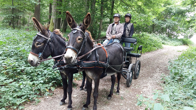 Le samedi qui suivit le stage, j’ai garni et attelé mes compagnons et nous sommes allé faire notre petit tour hebdomadaire, accompagné d’un ami, et oui nous ne rêvions pas, nos ânes étaient attelés en paire, mon pote n’en croyait pas ses yeux. Au début un peu nerveux et surtout content de sortir, puis ensuite docile et obéissant, au pas, au trot, au pas, au galop, droite, gauche, ho, hue etc…….Magique !!! MERCI Gérard, MERCI.