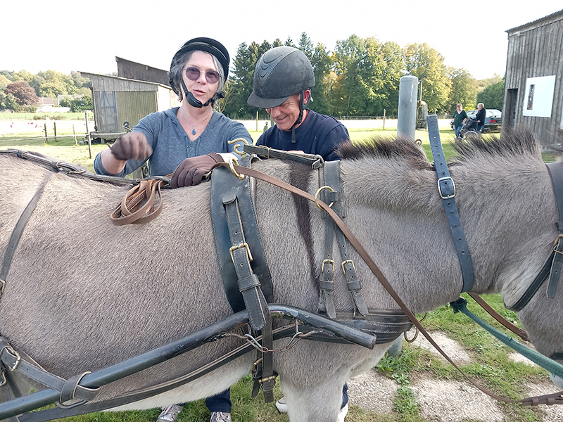 Je suis d’abord allé en stage 2 jours chez « ANENA » à Villotran et accompagné de 9 autres stagiaires nous avons appris à panser, garnir, atteler et mener l’attelage avec « Teddy » et « Balthazar », les ânes de Gérard.